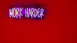 There are so many questions here. First, notice the sign – work harder. White hot letters with a purple glow on a red hot background.