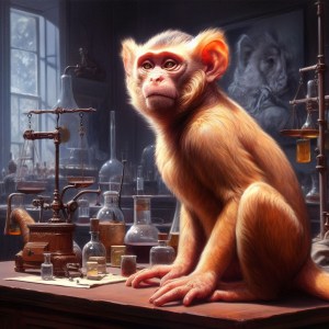 An oil painting of a chimera monkey sitting on a table in a science lab.